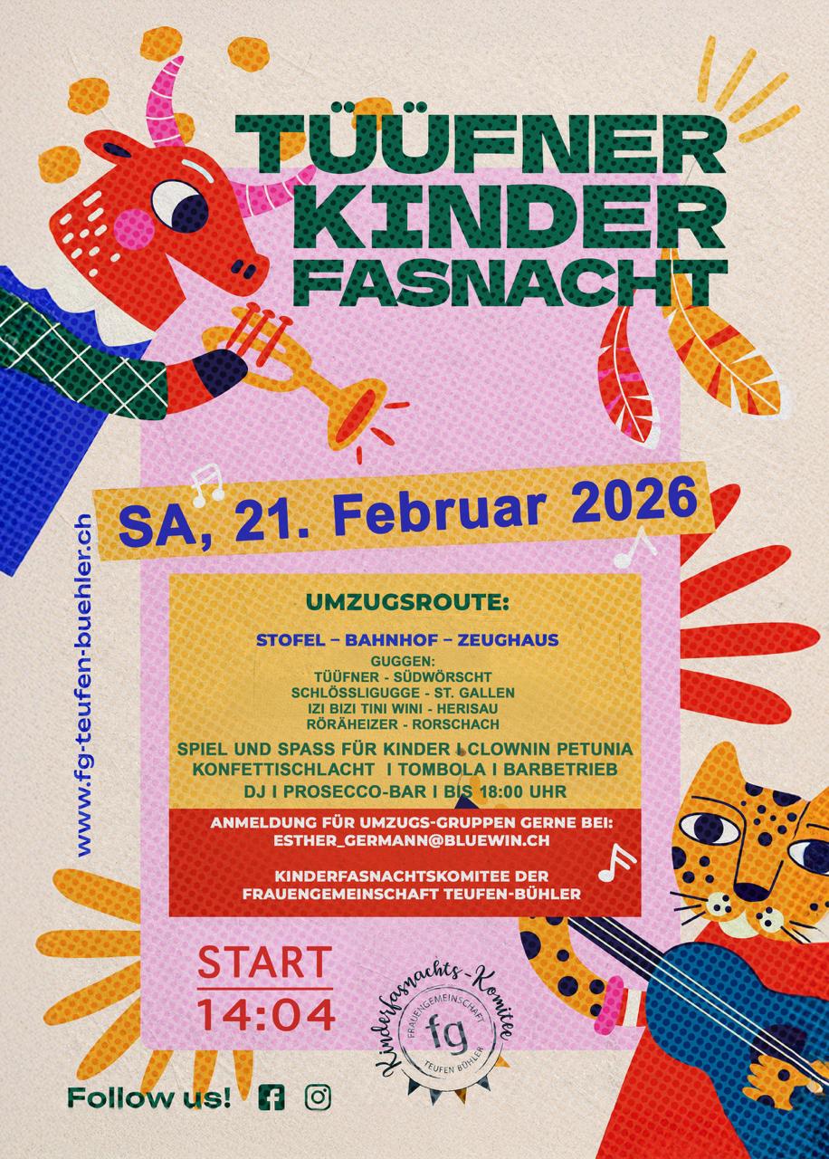 Am Samstag, 21. Februar 2026, findet in Teufen die traditionelle Kinderfasnacht, mit Umzug und Guggen statt.